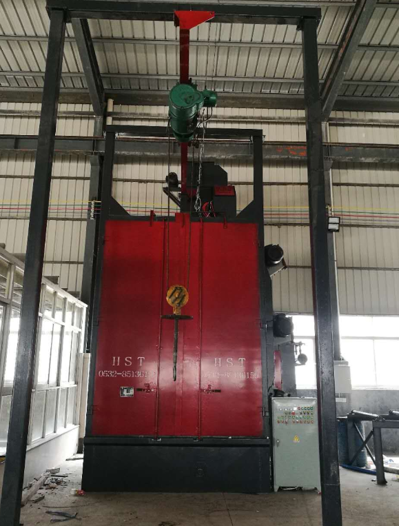 吊鉤式拋丸機當準備工作(除塵系統、提升機、螺旋輸送器等運行)完畢后,機器開始正常工作。首先,吊鉤下降吊起工件,上升至一定位置,然后沿軌道進入拋丸清理室,當到達預定位置后停止并開始自轉。此時關閉拋丸清理室大門,打開拋丸器,開供丸閘,開始對工件進行拋丸清理。重復此過程直至工作完畢,按順序停機。